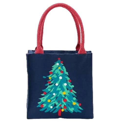Perfect for the holidays, this gift bag features a delightful painted Christmas tree adorned with colorful lights on a navy blue background. It is sure to compliment any gift given this Christmas! A top-selling category, our eco-friendly reuse and repurpose Itsy Bitsy totes are a great green alternative for anything from gift wrap to lunch bags and mini carryalls. The possibilities are endless! Dimensions: 5″ l x 8″ w x 8″ h