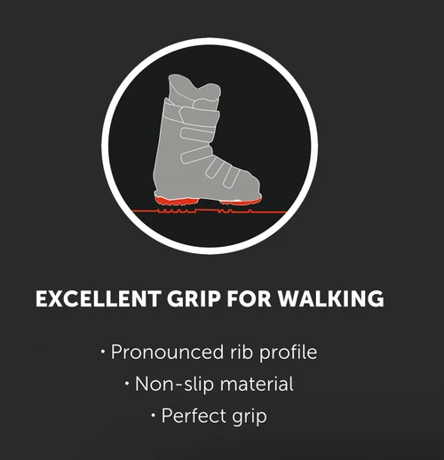 We’ve all been there – when it’s just a short stroll over frozen snow or slushy sections. But the route over slippery steps and wet wooden terraces can quickly become a complete slide fest. Ski boots simply don’t seem to be made for walking. Don’t be silly! Using GripWalk soles will put an end to sliding. The curved profile ensures natural rolling properties and increased walking comfort whilst the ribbed hi rubber profile provides the grip you need to stop sliding before it starts.