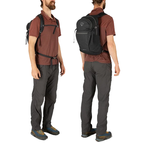 - Spacer mesh harness with integrated handle.Additional die-cut EVA foam padding (Daylite® Plus only). Adjustable sternum strap with whistle