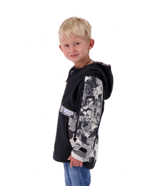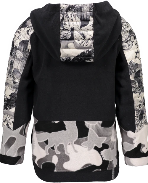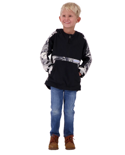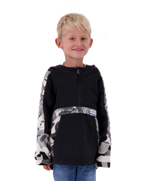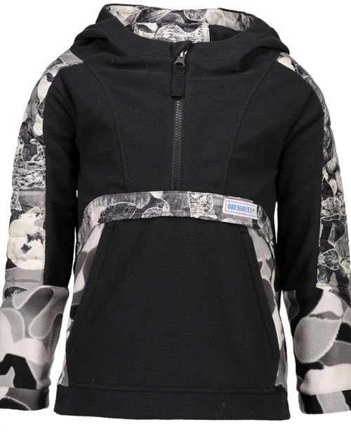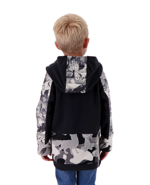 Your boy will feel like a super hero in this soft 100 wt pullover fleece blended with water-resistant fabric and 220 gms of insulation for just the right amount of warmth. Fun with color and prints, this pullover hoody is one of a kind. Featuring a kangaroo style pocket pouch, integrated hood, and drop-back hem. The Dyno will make your little guy roar.