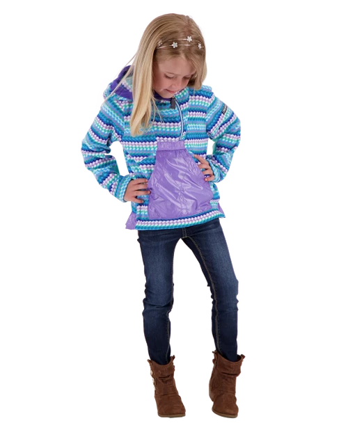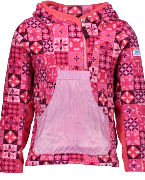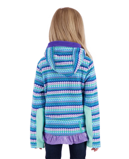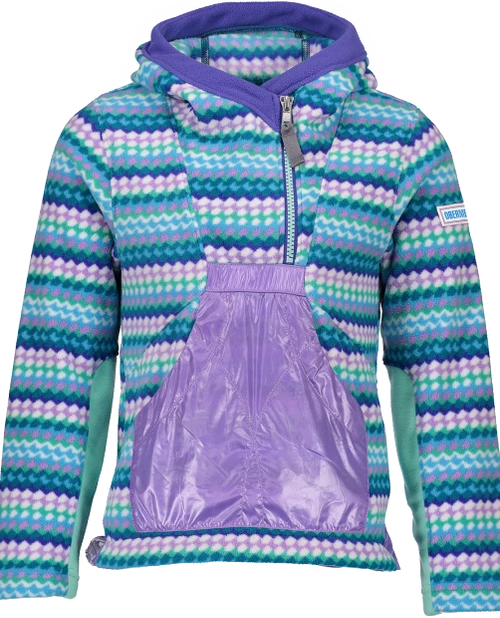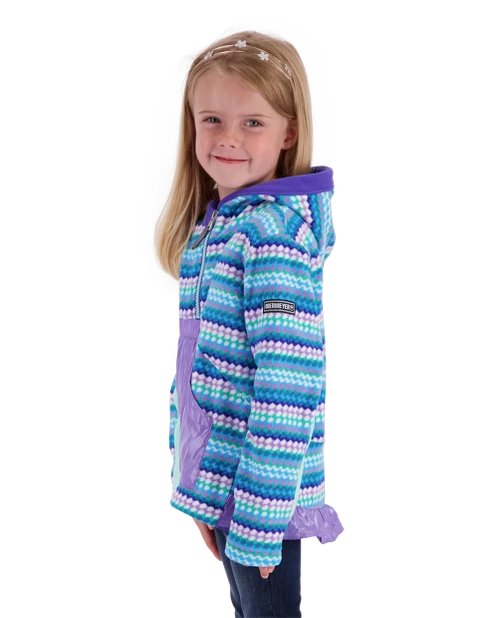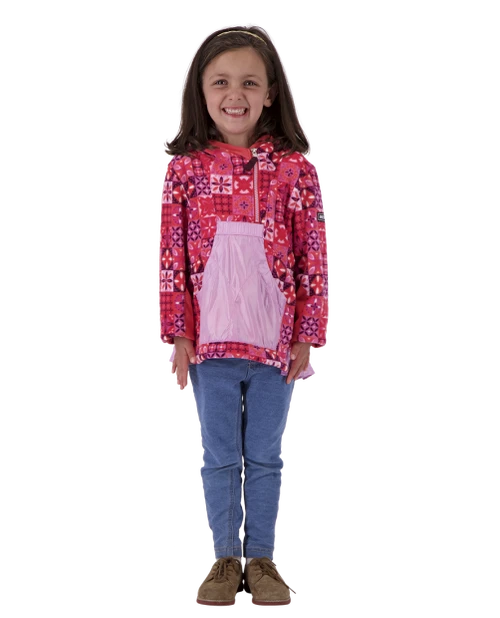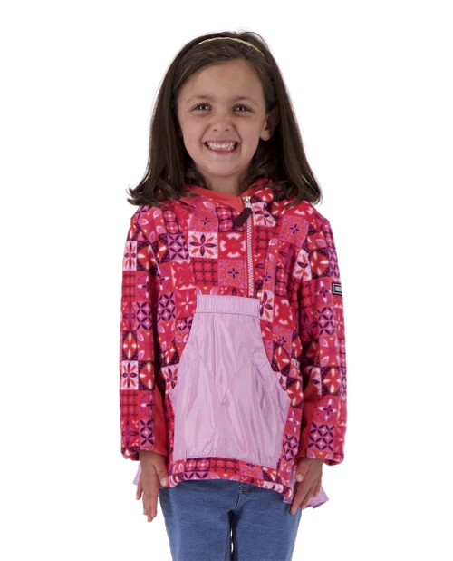 A truly special fleece that brings smiles to parents and girls alike with lively pops of color and prints. The Aiya features our double-sided brushed fleece for warmth and coziness. This pullover fleece has a cute drop-back hem, kangaroo style pocket, integrated hood, and stretch sleeve panels for performance fit.