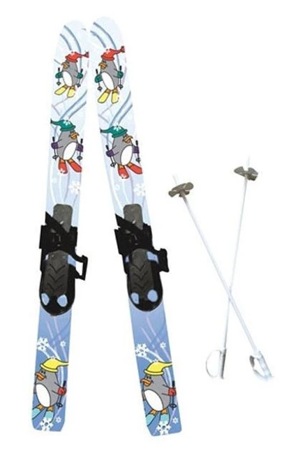 The Little Racer Chaser Kid’s Ski set comes with bindings and poles and is perfect for kids 1-3 years old to enjoy skiing and outdoor winter fun. Until age 24-30 months, a child’s feet are usually not big enough to fit into regular ski boots, so plastic ski’s are necessary. These skis come with very adjustable plastic bindings, so any warm, winter snow boots work well. At 70cm in length (26.5in), they have 8″ of gentle fish scales under the bindings to allow some traction when walking around on slippery snow. Makes a great gift for young skiers!